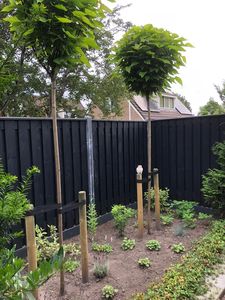 Zo mochten we ook in deze tuin nog eens een kijkje nemen. We hebben hier een terras gelegd van Smartton XXS tegels. Een veelgebruikte tegel, maar zeker niet alledaags. En natuurlijk gebruiken we ook vaak de bestrating die al aanwezig is, weer opnieuw. Niet alleen prijsbewust, maar ook duurzaam. Deze mensen wilden graag een zwarte hout-betonschutting. Maar hoe leuk is het om dat af te wisselen met losse douglas palen die een klein stukje uit elkaar staan? Een speels effect en toch een afgesloten tuin. En de beplanting is al mooi aangeslagen. Zo maken wij gebruik van een assortiment planten die heerlijk geurt, weelderig bloeit en qua kleuren goed met elkaar combineert.