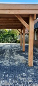 Wist u dat we van de details zijn? Bij deze overkapping hebben we de palen ingekeept. Dat geeft een mooiere uitstraling en een stevig resultaat. Standaard werken wij al onze overkappingen en carports af met een aluminium daktrim. Het straatwerk heeft een stevige ondergrond van gebroken puin en een laag zand. Tussendoor trillen wij alle lagen aan met een zware trilplaat. Zo weet u zeker dat u nog jaren plezier zult hebben van uw inrit. Hoveniersbedrijf de Korenbloem: Klasse tuinen!